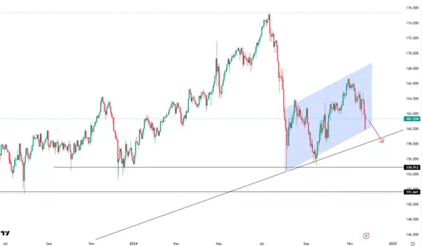 首要是趋势线所在的158.60一线,8-9月低点区域155一线则是更空头更重要的目标,也可能会引发一定程度的反弹。