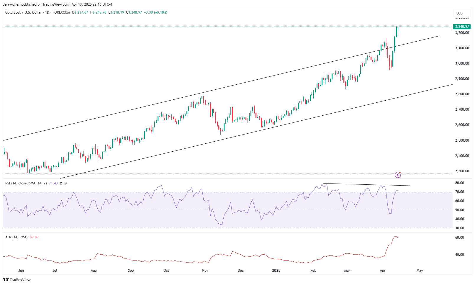 值得注意的是,当前黄金走势和2011年8月触及当时的新高1911美元时颇为相似,平均真实波幅ATR(14)也都处于60上方。
