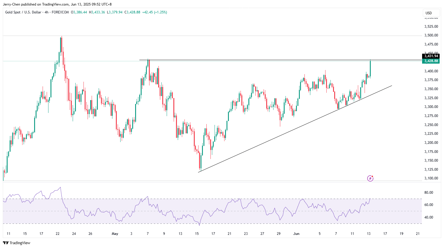 地缘风险帮助黄金打破了过去几周的平静走势,金价周五早盘再次突破3400美元关口,并逼近前高3435。