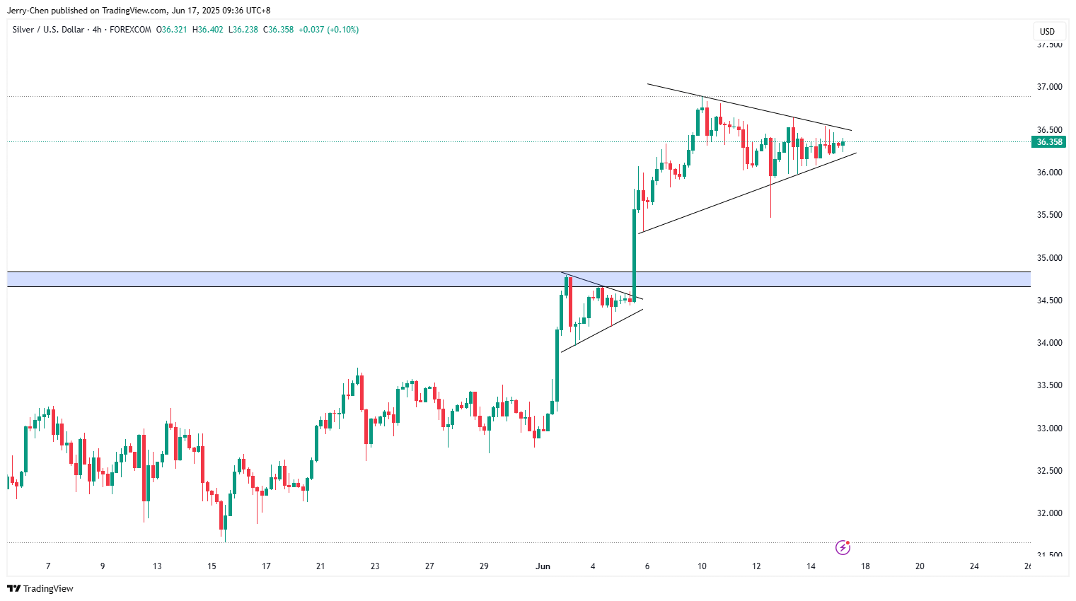 由于白银本身就处于多头走势之中,若能顺利突破当前形态,上方目标或瞄向前高37以及40美元上方。反之,下方支撑可以依次关注36、35.50,以及更关键的35美元一线。
